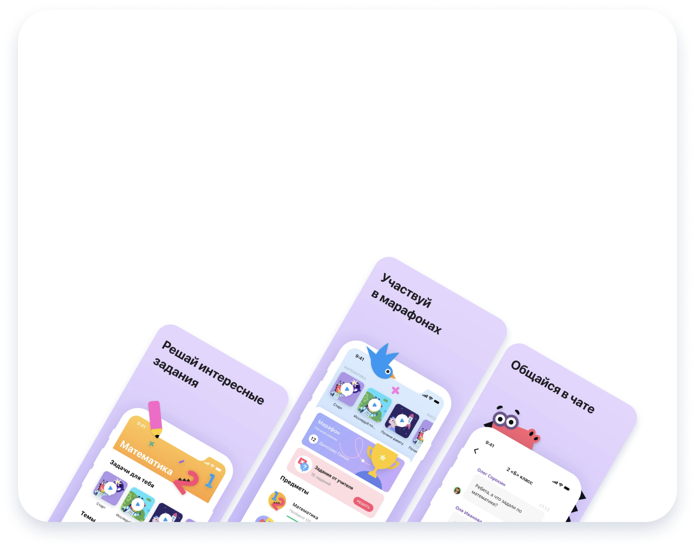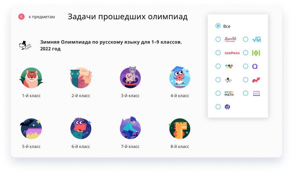 На Учи.ру также проводятся образовательные соревнования по математике, русскому и английскому языкам, программированию, финансовой грамотности, окружающему миру и другим предметам.